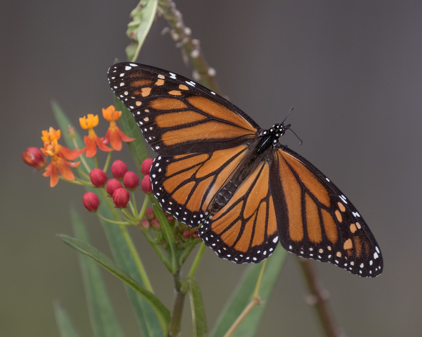 Queen - This one is listed as (A) abundant, though we only saw a couple. From the underside, easily confused with a Monarch. However the upperside lacks the black veining. The black spots on the inner hind-wing mark this as a male.